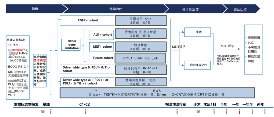 III期NSCLC的异质性高,可切除、不可切除的划分还存在争议,治疗模式存在混杂。为了进一步探索这类患者的治疗模式,我们开展了以患者为中心、前瞻性、多中心、开放标签、伞型II期临床试验,纳入III期不可切除的NSCLC患者,基于驱动基因、免疫特征等因素设置研究队列,细分免疫冷肿瘤和热肿瘤,探索新型药物精准治疗的疗效,研究即将启动。