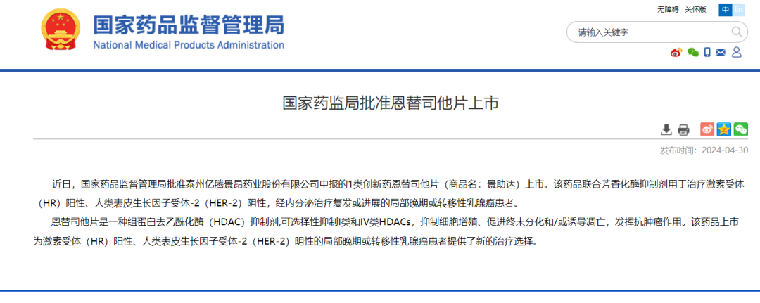 编者按:乳腺癌是威胁全球女性健康的首位恶性肿瘤,其中HR+/HER2-乳腺癌是主要亚型,临床中多以CDK4/6i联合内分泌治疗(ET)为一线标准治疗方案。在后CDK4/6i时代,组蛋白去乙酰化酶抑制剂(HDACi)成为了新的选择。2024年4月24日,国家药品监督管理局(NMPA)批准了国产HDACi恩替司他(Entinostat)联合芳香化酶抑制剂(AI)用于HR+/HER2-,经内分泌治疗复发或进展局部晚期或转移性乳腺癌患者。日前,在恩替司他在北京、广东、广西等多地同步开出全国首批处方,标志着恩替司他实现临床可及,即将改变临床治疗格局。《肿瘤瞭望》特邀空军军医大学西京医院李南林教授介绍恩替司他的临床研究数据,以期优化恩替司他的临床实践,做好乳腺癌患者的临床管理。