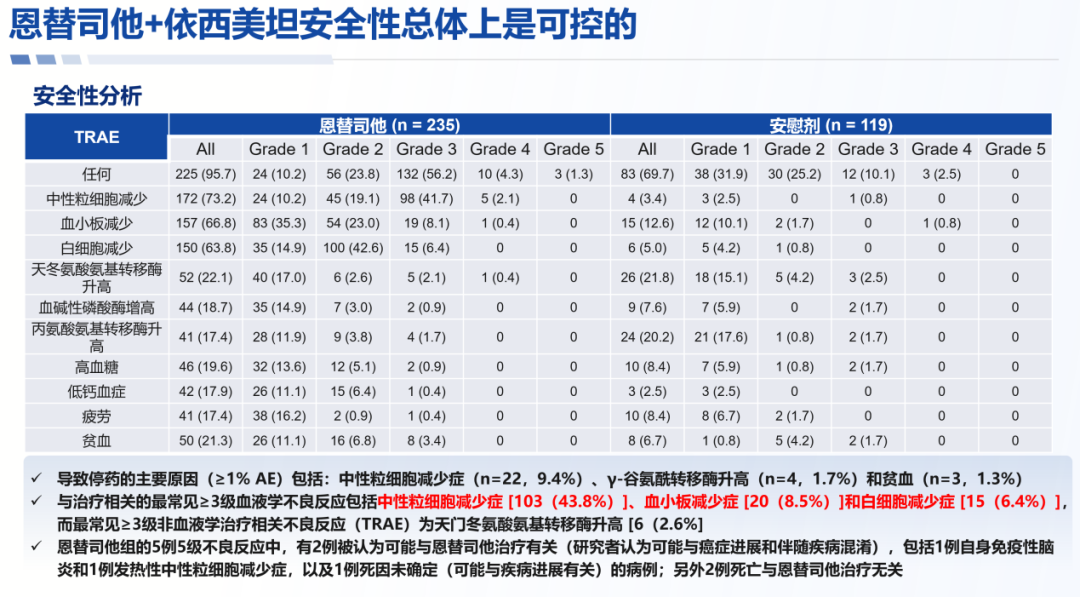 基于EOC103A3101研究可见,恩替司他组与安慰剂组≥3级治疗相关不良事件(TRAE)的发生率分别为65.5%和19.3%。恩替司他+依西美坦常见的≥3级血液学不良事件为中性粒细胞减少(43.8%)、血小板减少(8.5%)、白细胞减少(6.4%);≥3级非血液相关不良事件为天门冬氨酸氨基转移酶升高(2.6%)。虽然恩替司他较安慰剂组≥3级TRAE发生率更高,但患者的耐受性并不差,恩替司他组与安慰剂组中位治疗时间分别为20周和16周,因AE导致停药的比例为14%和5%。恩替司他联合依西美坦主要停药不良事件包括中性粒细胞减少症(9.4%)、γ-谷氨酰转移酶升高(1.7%)和贫血(1.3%)。恩替司他组仅2例5级不良事件可能与治疗相关,研究者认为可能也与疾病进展相关,包括1例自身免疫性脑病和1例发热性中性粒细胞减少症(FN)。