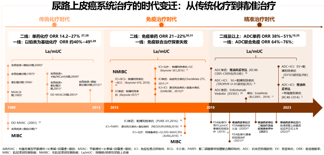 尿路上皮癌(UC)的系统治疗药物发展历经传统化疗、免疫治疗、精准治疗等三个主要时期。在上世纪80~90年代,细胞毒药物、铂类药物等化疗方案成为尿路上皮癌的重要治疗策略;以GC、MVAC等含顺铂化疗的两药方案、多药组合方案,应用于从一线治疗到MIBC围术期治疗的多个阶段。以铂类为基础的化疗方案获得的ORR为40%左右,但是化疗同时带来明显骨髓抑制效果,≥3级不良事件发生率较高。