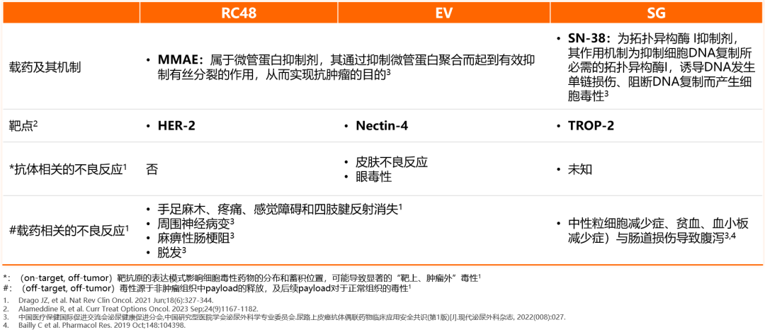 目前已经获批用于尿路上皮癌的ADC当中,国外的2种药物(EV和SG)相关研究多入组非中国患者。在3~4级不良反应发生率方面,EV和SG分别有73%和68%严重不良事件发生。对于三种药物的常见不良反应,RC48、EV均可能出现外周神经方面的不良反应;而对于EV而言,皮肤相关不良反应发生率高于外周神经病变。SG的常见不良反应为消化道毒性,包括严重腹泻。(非头对头比较,入组患者有差异,谨慎解读数据)