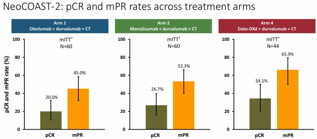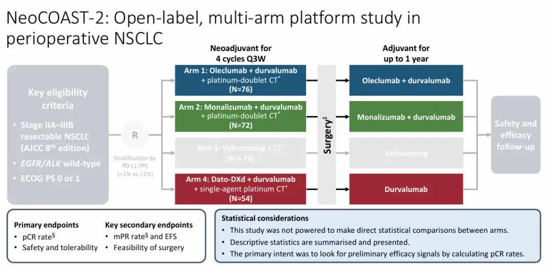 NeoCOAST-2研究招募了EGFR/ALK野生型、ECOG PS评分为0或1、IIA~IIIB期的可切除NSCLC患者。主要终点是病理完全缓解(pCR)率和安全性/耐受性。关键次要终点包括主要病理缓解(mPR)率、无事件生存(EFS)和手术可行性。NeoCOAST-2的主要目标是通过计算pCR率来检验疗效信号,该研究无法对各组进行直接的统计学比较。患者被随机分配接受4个周期的新辅助治疗(每3周一次);方案包括抗CD73药物oleclumab+度伐利尤单抗+含铂双药化疗(组1)、抗NKG2A药物monalizumab+度伐利尤单抗+含铂双药化疗(组2)、volrustomig+化疗(组3)或TROP2抗体-药物偶联物(ADC)Dato-DXd+度伐利尤单抗+单药铂类化疗(组4)。然后,所有患者进行手术并接受相应的辅助治疗方案(不包括化疗),最长1年。2024 WCLC未报告组3的数据。