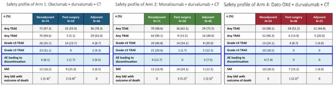 组2有29.6%的新辅助治疗期(n=71)患者、1.7%的术后治疗期(n=58)患者和12.5%的辅助治疗期(n=40)患者发生≥3级TRAE。在新辅助治疗阶段的≥3级TEAE包括贫血、中性粒细胞减少、脱发、腹泻和血小板减少。AE分别导致12.7%、0.0%和7.5%的患者停药。此外,4名患者死于严重不良反应(3名患者在术后因全肺切除术相关的脓毒症、肺叶切除术相关的感染性休克和双肺叶切除术相关的肾衰竭而死亡;一名患者在辅助治疗期间因与度伐利尤单抗和monalizumab相关的心肺骤停而死亡)。