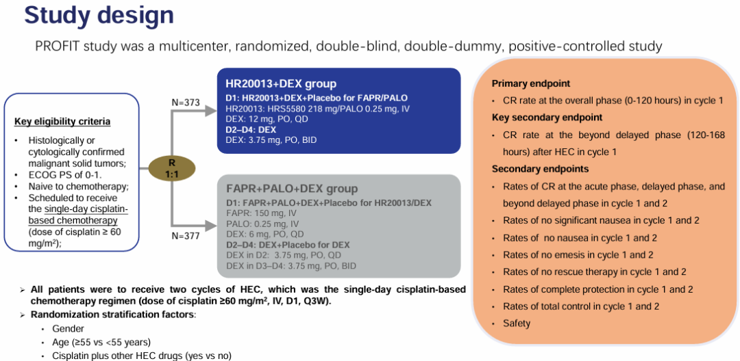 张力教授:PROFIT研究是一项在接受含铂化疗(主要是顺铂)的恶性肿瘤患者中进行恶心呕吐预防的多中心、随机、双盲、阳性对照的III期非劣效临床试验,共入组了700多例患者。患者被随机分成两组,一组接受HR20013+地塞米松,对照组患者接受福沙匹坦+帕洛诺司琼+地塞米松三联方案。