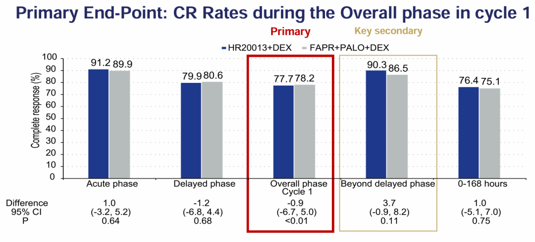 PROFIT主要终点是第1周期顺铂为基础的HEC后总阶段(OP;0-120小时)内的完全缓解(CR;无呕吐/无额外干预)率。主要终点的非劣效性检验使用了-10%的差异作为非劣效性界限。我们在WCLC公布的研究结果显示,在HR20013+地塞米松治疗组,第一个周期的CR率能够达到77.7%,而对照组是78.2%,完全达到非劣性标准,P值<0.01。