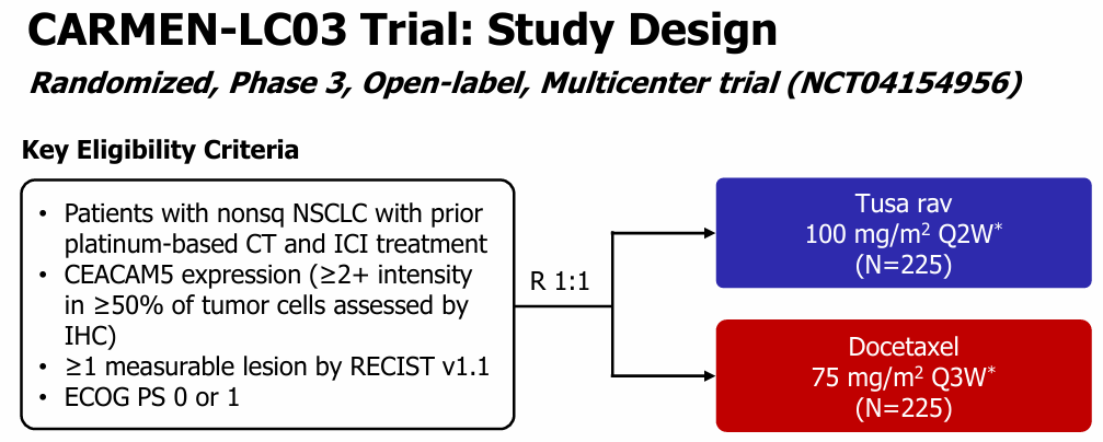 III期、开放标签、多中心CARMEN-LC03试验将389名患者按1:1的比例随机分配接受Tusa治疗(100mg/m2,每2周)或多西他赛(75mg/m2,每3周)治疗。主要入选标准包括:非鳞状NSCLC患者,之前接受过铂类化疗和免疫检查点抑制剂(ICI)治疗,在≥50%肿瘤细胞中免疫组化(IHC)显示CEACAM5表达强度≥2+,根据RECISTv1.1标准有≥1个可测量病变,ECOG PS评分为0或1。