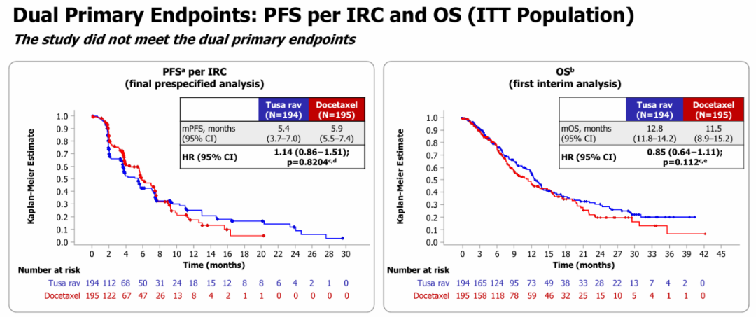 在意向治疗(ITT)人群中,中位随访时间为7.4个月,Tusa组(n=194)和多西他赛组(n=195)的独立审查委员会(IRC)评估的中位PFS为5.4个月和5.9个月(HR=1.14;95%CI:0.86-1.51;P=0.8204)。在18.1个月的中位随访期内,第一次中期分析的OS分别为12.8个月和11.5个月(HR=0.85;95%CI:0.64-1.11;P=0.112)。“PFS和OS是双重主要终点。以上结果导致研究提前终止,”古斯塔夫鲁西研究所Dr.Benjamin Besse在报告中指出。
