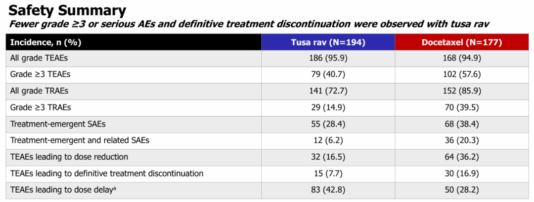 在Tusa组和多西他赛组,导致剂量减少的TEAE分别发生在32名(16.5%)和64名(36.2%)患者身上;15名(7.7%)和30名(16.9%)患者发生导致最终停止治疗的TEAE。