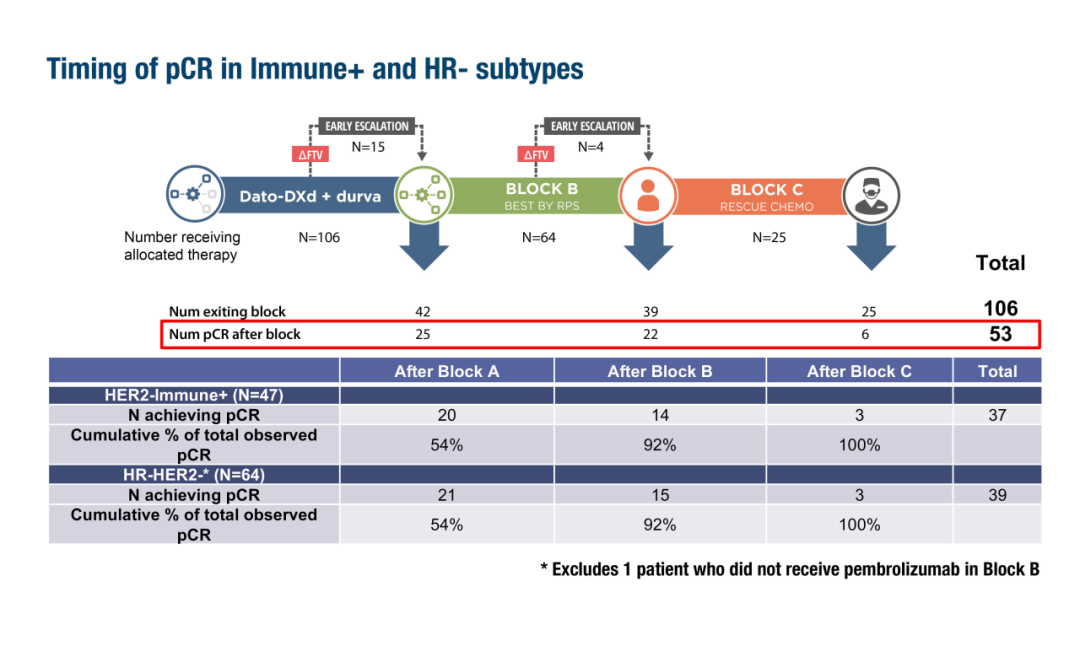 根据2024年ESMO大会上的报告,在I-SPY 2.2试验(LBA15)中,对于免疫组化标记阳性的患者,新辅助datopotamab deruxtecan+durvalumab治疗达到了79%的病理完全缓解(pCR)率(主要终点);而对于HR-/HER2-乳腺癌患者,该联合方案的pCR率为62%。在所有患者亚组中,报告的超过50%的pCR率是在接受datopotamab deruxtecan+durvalumab治疗后实现的,因此无需使用基于紫杉类和蒽环类的方案。