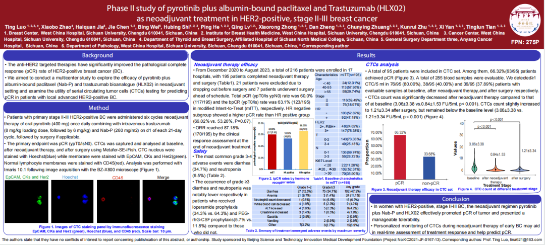 HLX02(中国商品名:汉曲优),是中国首个自主研发的曲妥珠单抗生物类似药,在中国、欧盟、美国等多个国家和区域均获批上市。随着吡咯替尼新辅助适应症在中国的获批,曲妥珠单抗联合吡咯替尼和化疗也成为了HER2阳性早期或局部晚期乳腺癌新辅助治疗的可选方案之一,目前HLX02联合吡咯替尼新辅助治疗的数据仍然欠缺。四川大学华西医院罗婷教授牵头开展的全国多中心“曲妥珠单抗(HLX02)联合吡咯替尼和白蛋白紫杉醇新辅助治疗HER2阳性早期或局部晚期乳腺癌的Ⅱ期研究”在2024年ESMO大会上公布了最新结果。