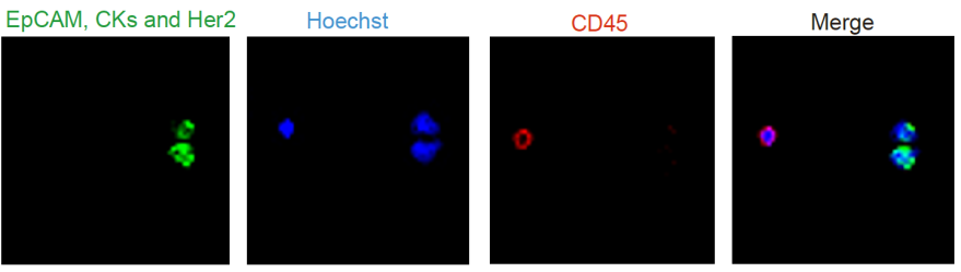 图1.免疫荧光染色EpCAM、CKs、Her2(绿色)、Hoechst(蓝色)、CD45(红色)的CTC染色面板图像。