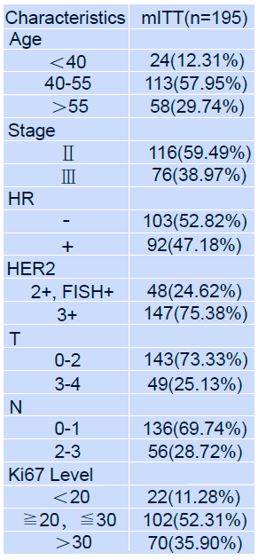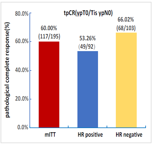 在改良的意向人群(mITT)中,pCR(ypT0/is ypN0)率为60.0%;bpCR(ypT0/is)率为63.1%(123/195)。