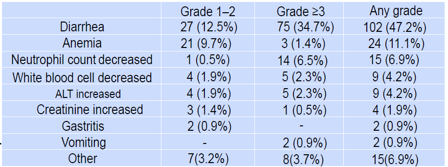 最常见的3-4级不良事件是腹泻(34.7%)和中性粒细胞减少(6.5%)(表2)。其他≥3级不良事件还包括白细胞减少(2.3%)、ALT升高(2.3%)、贫血(1.4%)、肌酐升高(0.5%)、呕吐(0.9%)(表2)。