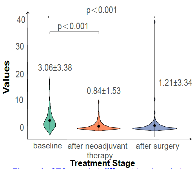 与基线相比,新辅助治疗后CTCs计数显著降低(3.06±3.38 vs.0.84±1.53 FU/5ml,P<0.001)。术后CTCs计数略有增加,为1.21±3.34,但仍低于基线水平(3.06±3.38 vs.1.21±3.34 FU/5ml,P<0.001)(图3)。