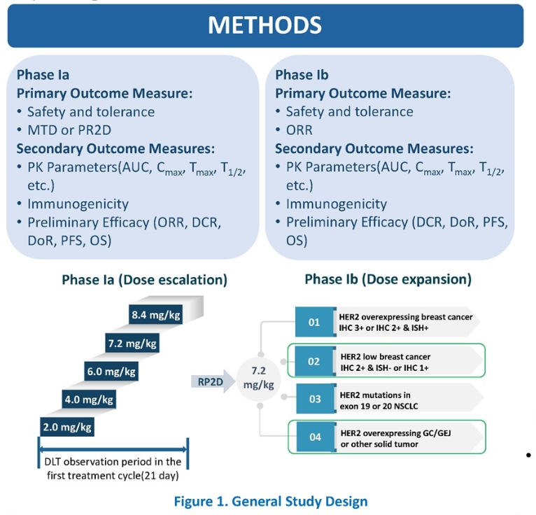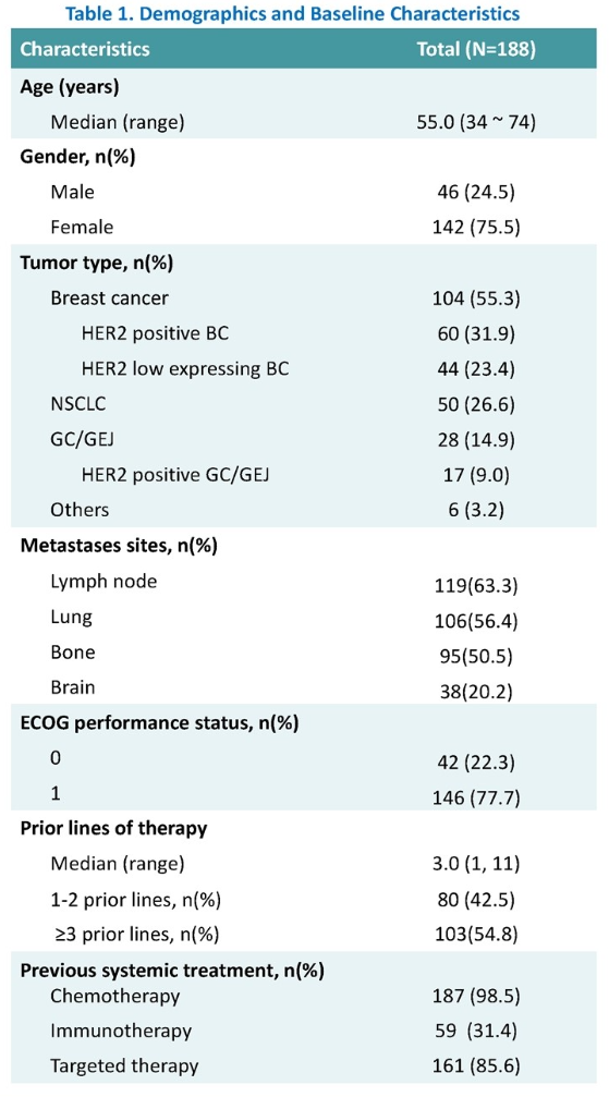 Ib期临床研究(剂量扩展阶段)入组的患者超过半数接受多线(3线及以上)治疗。将入组患者根据瘤种及HER2检测结果分为4个队列,分别为HER2高表达乳腺癌、HER2低表达乳腺癌、HER2外显子19/20突变NSCLC以及HER2表达(IHC2+/3+)胃癌,扩展期推荐剂量为7.2 mg/kg。
