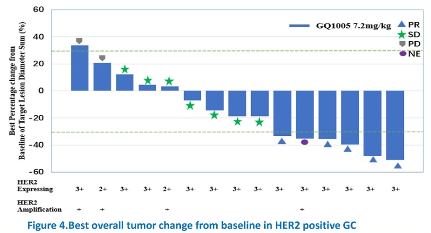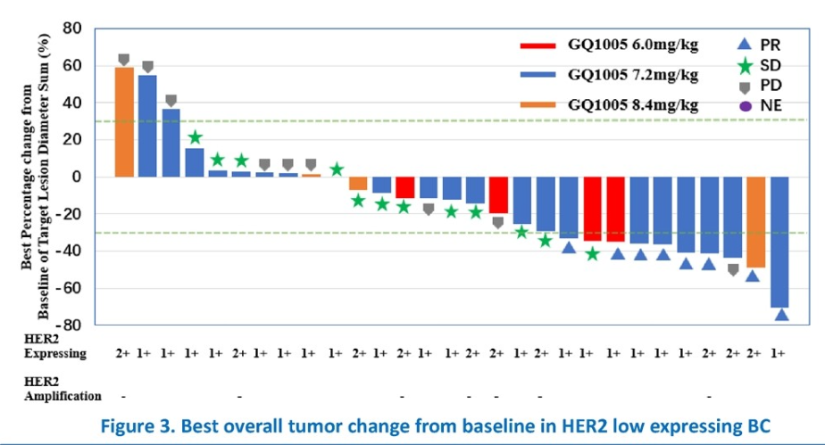 此次会议上,我们报道了GQ1005治疗晚期/转移性HER2低表达乳腺癌和HER2阳性胃癌的初步结果。在29名可评估疗效的HER2低表达乳腺癌患者中,客观缓解率(ORR)为27.6%,疾病控制率(DCR)为69.0%,中位无进展生存期(mPFS)为10.4个月,中位缓解持续时间(mDOR)为11.9个月。6个月PFS率为68.39%。