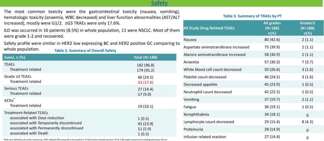 在15名可评估疗效的HER2阳性胃癌患者中,ORR为33.3%,DCR为80%,6个月PFS率为70.0%。两个队列的不良事件(AE)谱与整体人群一致,每个队列中仅发生1例间质性肺病(ILD)。