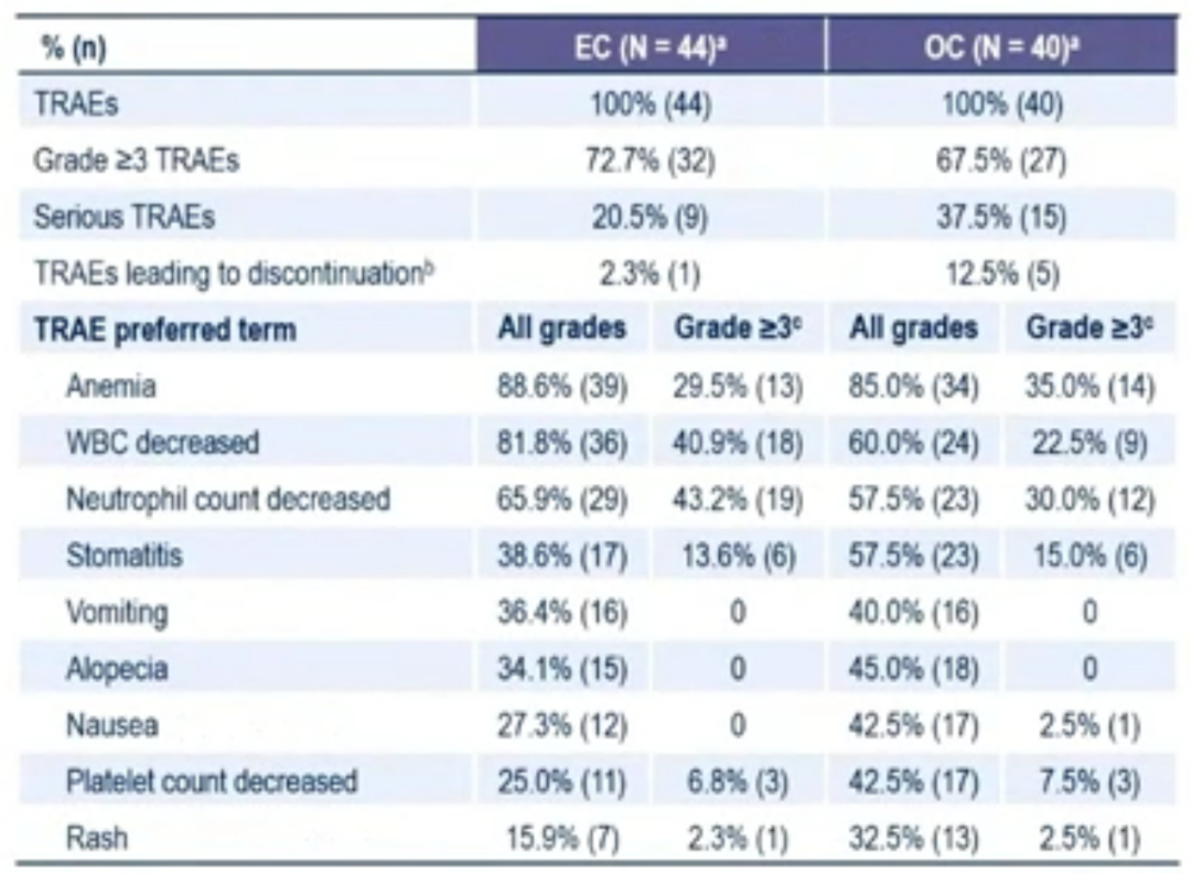 从安全性角度来看,这款ADC药物的表现与大多数同类药物相似,主要不良事件为血液毒副作用。这是我们妇科肿瘤医生较为熟悉的不良事件,因此处理起来相对得心应手,可控性也较强。