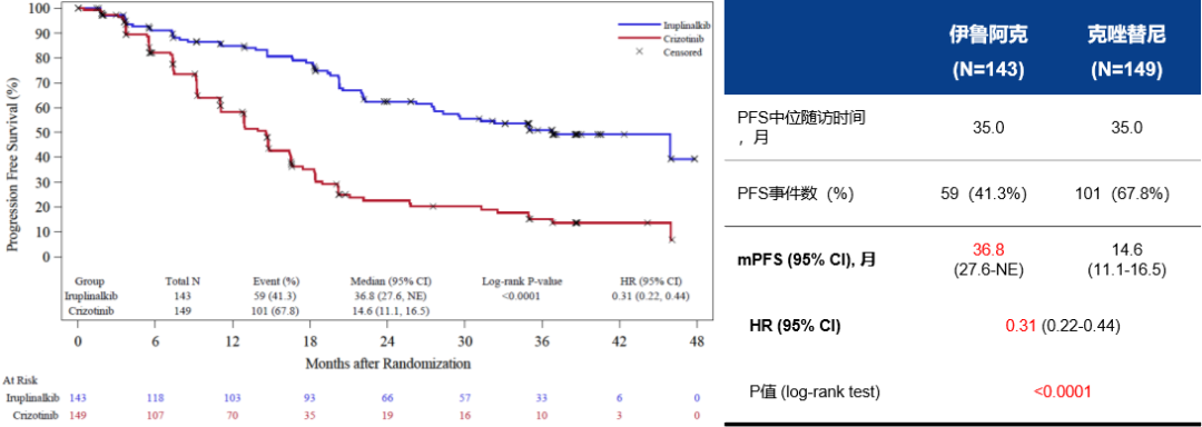 本次更新分析的数据截止日期为2023年10月25日,伊鲁阿克组和克唑替尼组的独立评审委员会(IRC)评估的PFS中位随访时间均为35.0个月;中位PFS为36.8个月vs.14.6个月,HR为0.31(P<0.0001)。对于基线伴中枢神经系统(CNS)转移的ALK阳性NSCLC患者,两组由IRC评估的中位PFS分别为26.3个月和11.0个月,HR为0.21(P<0.0001);对于基线不伴CNS转移的ALK阳性NSCLC患者,两组由IRC评估的中位PFS分别为45.9个月和16.4个月,HR为0.33(P<0.0001)。此外,伊鲁阿克组和克唑替尼组的36个月总生存期(OS)率分别为81.3%和75.8%。