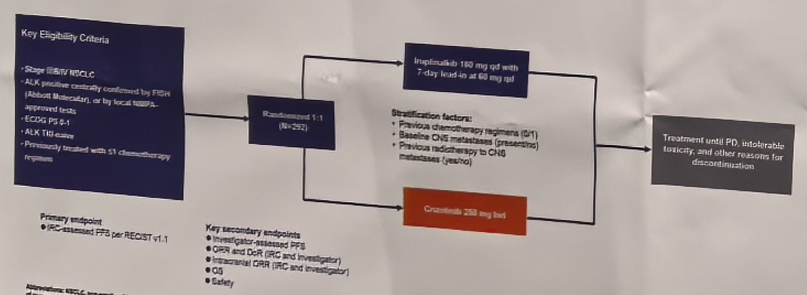 INSPIRE(NCT04632758)是一项开放标签、随机、多中心的Ⅲ期临床研究,旨在评价伊鲁阿克对比克唑替尼在既往未接受过ALK TKI治疗的局部或转移性ALK阳性晚期NSCLC患者中的疗效及安全性。主要终点是独立评审委员会(IRC)根据实体瘤反应评估标准1.1版评估的无进展生存期(PFS)。次要终点包括研究者评估的无进展生存期(PFS)、客观缓解率(ORR)和安全性等。从2019年9月4日到2020年12月2日间,共有292名患者被随机分组并接受治疗;143人使用伊鲁阿克,149人使用克唑替尼。