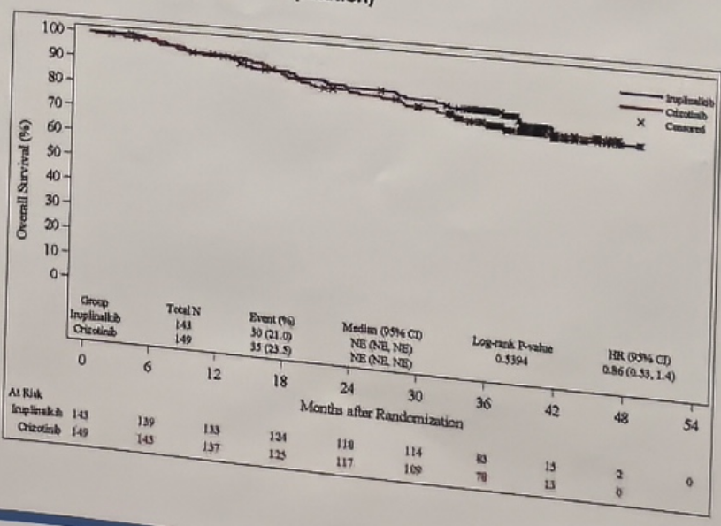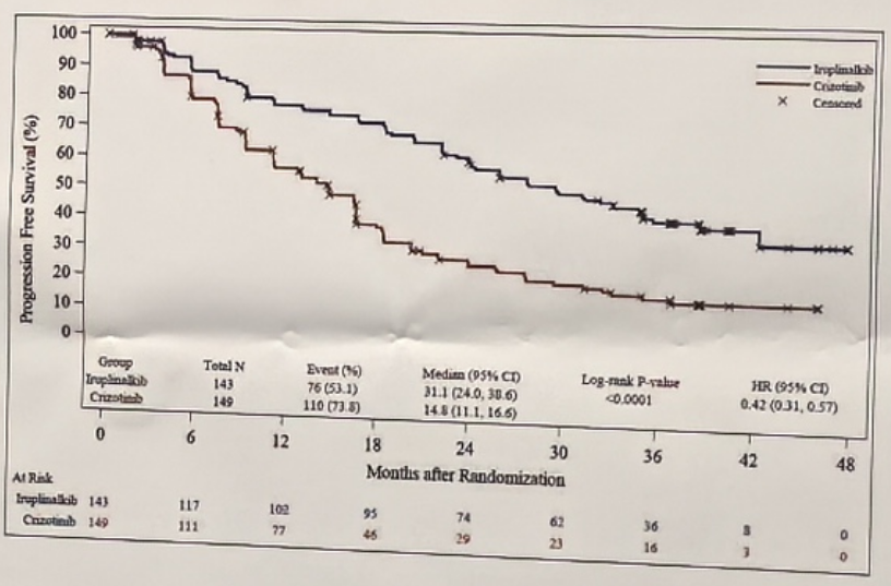 本次2024 ESMO大会报告的更新数据(数据截止日期:2023年10月25日)分析显示,IRC评估的伊鲁阿克组和克唑替尼组的中位随访时间分别为35.02个月和34.96个月。