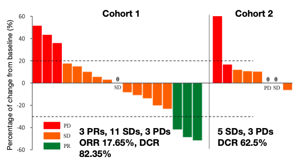 在队列1中,17例患者均可评估,ORR为17.65%(3/17),DCR为82.35%(14/17)。