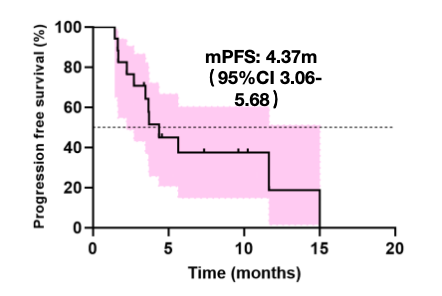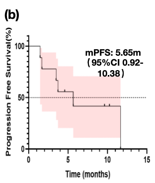 队列1中位PFS(mPFS)为4.37个月(95%CI:3.06~5.68),肺转移患者的mPFS较长(11.66 vs.3.70个月;P=0.3213)。在亚组分析中,9例LMS患者的mPFS为5.65个月,ORR为22.2%(2/9)。