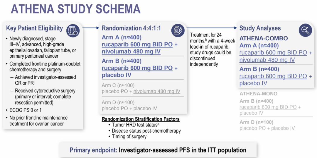 B.J.Monk,et al.LBA30-ATHENA-COMBO,a phase III,randomized trial comparing rucaparib(RUCA)+nivolumab(NIVO)combination therapy vs RUCA monotherapy as maintenance treatment in patients(pts)with newly diagnosed ovarian cancer(OC).Annals of Oncology(2024)35(suppl_2):1-72.10.1016/annonc/annonc1623