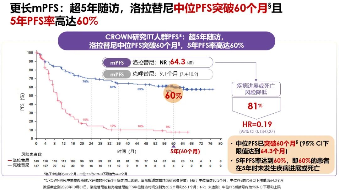 相比1/2代ALK-TKI,洛拉替尼的PFS曲线在较早期即出现平台期,这种趋势在里程碑式随访时间(如3年和5年)仍会保持,并且预测值可能随着随访时间延长而改善,从而增加实现长期无复发状态的可能性。5年长随访显示,洛拉替尼组的中后期获益趋势放大(HR值变小),为患者按下疾病进展的暂停键。抗肿瘤治疗实现更长PFS说明治疗对疾病产生了积极影响,增加患者迈向治愈的可能性,也会给患者带来积极的心理影响。