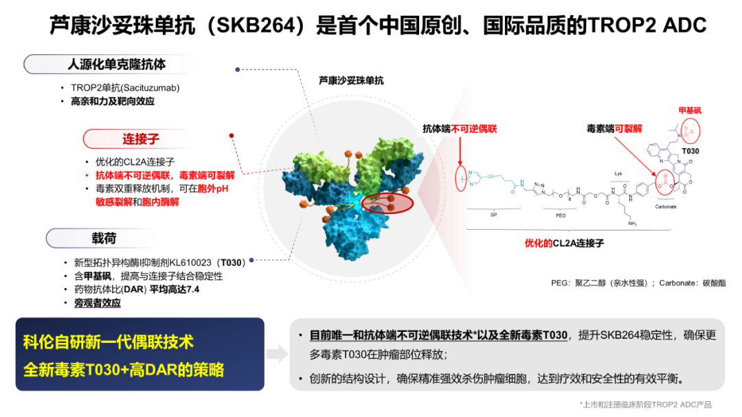 芦康沙妥珠单抗(SKB264)是首个中国原创的TROP2 ADC。通过优化的连接子CL2A将靶向TROP2的人源化单抗Sacituzumab和新型拓扑异构酶I抑制剂T030偶联而成,药物抗体比(DAR)平均高达7.4,具备旁观者效应。通过两项开创性的技术来优化芦康沙妥珠单抗的稳定性,第一、Kthiol偶联技术,使用甲磺酰基嘧啶(SP)连接头,与抗体不可逆偶联,不会发生解耦分离;第二、毒素T030含甲基砜,与连接子结合更稳定。双管齐下,血液循环中稳定性良好,有效降低脱靶毒性发生的风险,促使更多芦康沙妥珠单抗在肿瘤局部组织聚集,并通过双重释放机制(胞外pH敏感裂解、胞内酶解)快速、大量的释放T030,从而产生强大的抗肿瘤活性,实现“魔法子弹”的功效。芦康沙妥珠单抗通过靶向杀伤、旁观者效应和微环境杀伤三重机制精准强效的杀伤肿瘤细胞,兼顾疗效和安全性,达到全面平衡。