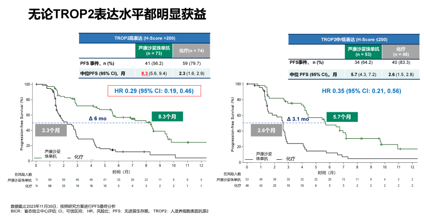 数据截至2023年11月30日(中位随访时间10.4个月),该研究已达到PFS主要终点。根据BICR评估的结果,芦康沙妥珠单抗组和化疗组患者的mPFS分别为6.7个月(95%CI:5.5-8.0)和2.5个月(95%CI:1.7-2.7)。相比化疗,芦康沙妥珠单抗显著降低疾病进展或死亡的风险68%(HR=0.32,95%CI:0.22-0.44,P<0.00001)。