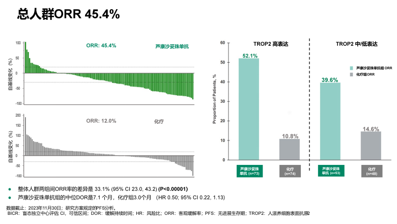 客观缓解率(ORR)芦康沙妥珠单抗组为45.4%,化疗组为12.0%,提升约4倍。肿瘤自基线变化的瀑布图显示大部分患者的肿瘤都获得一定程度的退缩,并且肿瘤缓解的持续时间较为持久(DOR为7.1个月)。