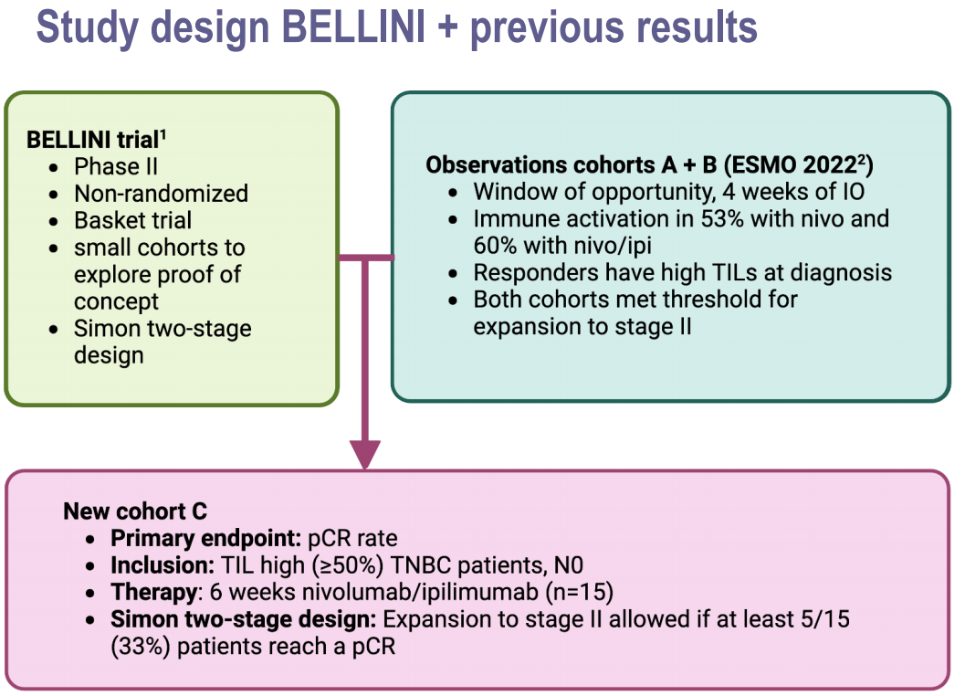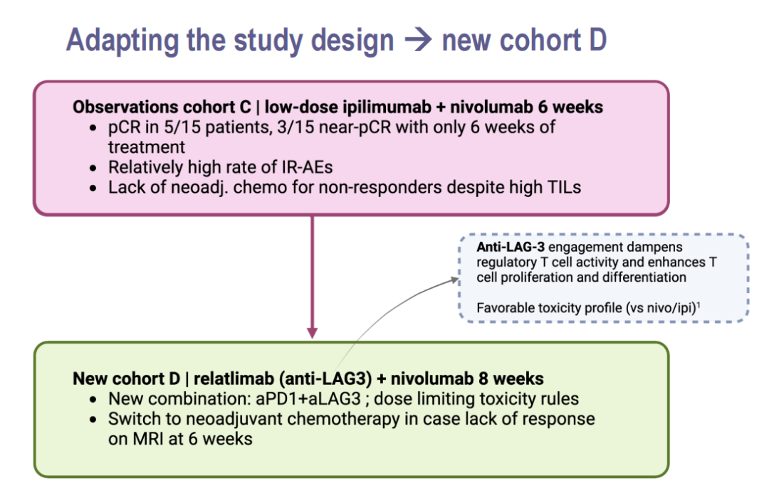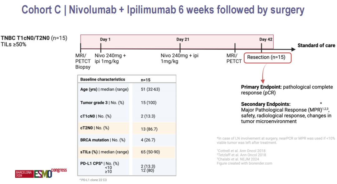 BELLINI是一项非随机对照研究,既往研究结果(队列A、B)提示,在不使用化疗的情况下,使用(联合)免疫治疗时,患者会出现免疫激活。此次ESMO大会上,公布了新的非随机队列(队列C、D)研究的结果。队列C、D分别纳入了15例I~II期、淋巴结阴性、TILs≥50%的TNBC患者,术前6周接受纳武利尤单抗+伊匹木单抗(nivo/ipi)1mg/kg(d1+d21,队列C,n=15)或8周纳武利尤单抗+relatlimab(nivo/rela,队列D,n=15)治疗。在nivo/rela队列中,6周时影像学评估为无应答的患者继续接受新辅助化疗,并被算作无应答者。主要终点为pCR率。次要研究终点包括主要病理缓解(MPR,定义为残余存活肿瘤≤10%)、MRI评估的影像学缓解率和安全性。