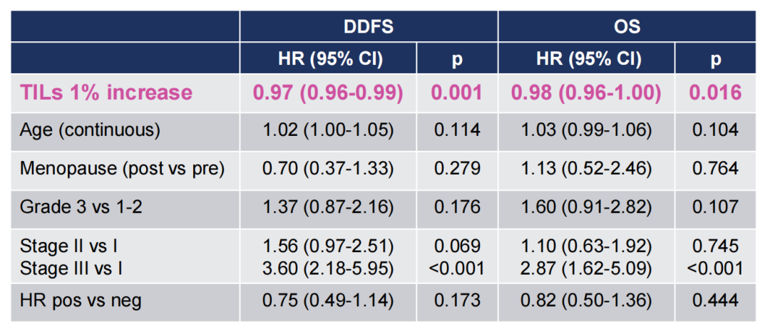 本次ESMO大会上报道的数据重点分析了TILs对患者预后的影响。对入组的866例患者进行9.02年(95%CI:9.00~9.04)随访,共发生了107例DDFS事件(比先前已发布的分析多24例),74例OS事件。多变量分析提示,TILs与生存显著相关,TILs的增加不仅与改善的DDFS显著相关(每增加1%TILs,HR 0.97,95%CI:0.96~0.989,P=0.001),还与更好的OS显著相关(每增加1%TILs,HR 0.98,95%CI:0.96~1.00,P=0.016)。
