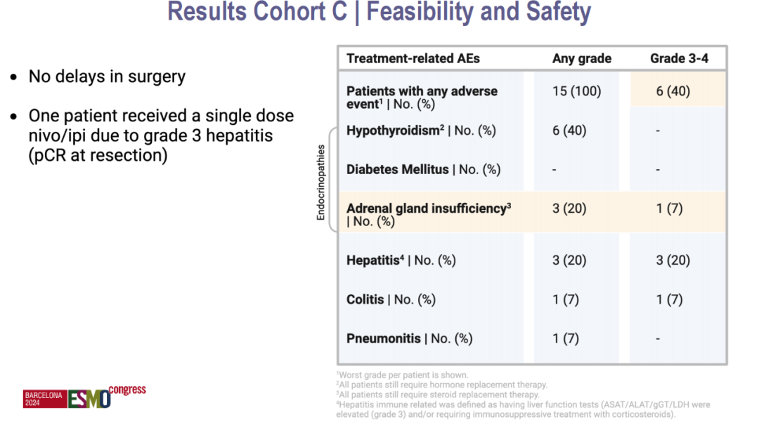 队列D采用nivo/rela双免疫联合治疗的方案,中位随访5.1个月,患者获得了更高的pCR率,47%(7/15)的患者达到了pCR,73%(11/15)的患者达到MPR(肿瘤缩小>90%)。