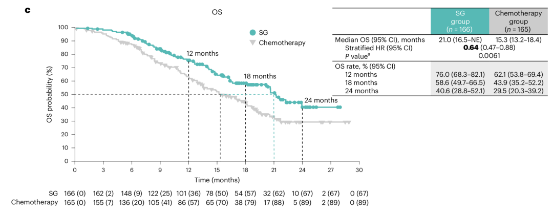 SG组和TPC组的mOS分别为21.0个月vs.15.3个月,提高了5.7个月,改善了患者的生存获益。