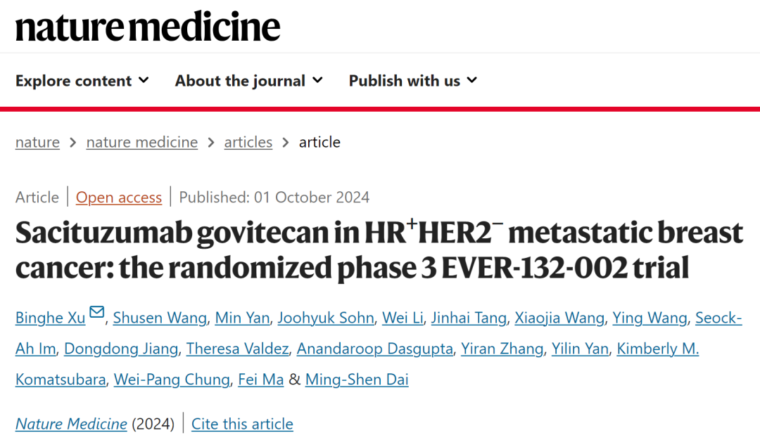 编者按:戈沙妥珠单抗(SG)作为全球首款Trop-2抗体偶联药物(ADC),基于ASCENT研究、TROPiCS-02研究,已在国际上取得晚期三阴性乳腺癌(TNBC)和晚期HR+/HER2-乳腺癌适应症,并获得了国内外指南的一致推荐。为了助推SG在国内实现可及,中国医学科学院肿瘤医院徐兵河院士领衔了SG在中国三阴性乳腺癌患者的桥接研究EVER-132-001研究和亚洲HR+/HER2-乳腺癌患者的EVER-132-002研究。2023年12月,ESMO ASIA年会中EVER-132-002研究一鸣惊人,其阳性结果为患者带来新的希望;2024年10月1日,EVER-132-002研究再传捷报,SG较化疗显著改善无进展生存期和总生存期。该研究全文刊于《Nature Medicine》,为亚洲HR+/HER2-mBC患者再传佳音,为国庆献礼。