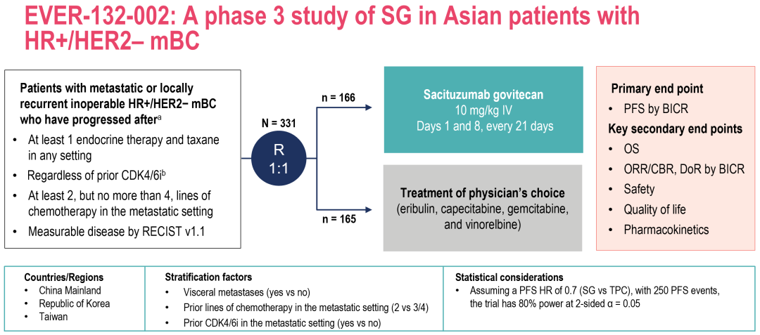 作为TROPiCS-02研究的桥接研究,EVER-132-002研究设计与之相似,同时兼顾亚洲地区临床诊疗特点。EVER-132-002研究共入组包括中国大陆、中国台湾、韩国在内的331例亚裔HR+/HER2-mBC患者,其中约70%来自中国大陆,要求患者既往接受过2-4次系统性化疗。考虑到研究设计之初入组国家、地区CDK4/6抑制剂的可及性有限,故本研究对于CDK4/6抑制剂经治与否不做强制限定。将参研患者按1:1随机分组后分别予以SG或医生选择的化疗方案(TPC)治疗,主要终点是根据盲法独立中央审查(BICR;RECIST v1.1)确定的无进展生存期(PFS)。次要终点包括总生存期(OS)、客观缓解率(ORR)、根据BICR确定的临床获益率(CBR)以及安全性[7]。