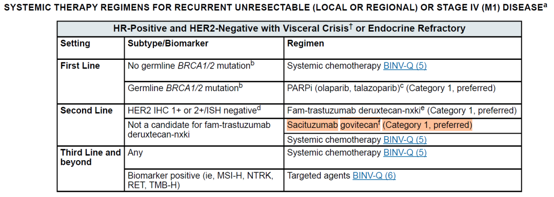 NCCN指南推荐SG作为HR+/HER2-内分泌耐药或内脏危象的二线优选方案