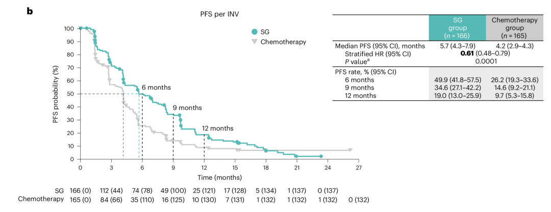 研究者评估的mPFS为5.7个月vs 4.2个月,HR为0.61(95%CI 0.48-0.79),P=0.0001,同样显示了SG的强效获益优势,与BICR结论一致。