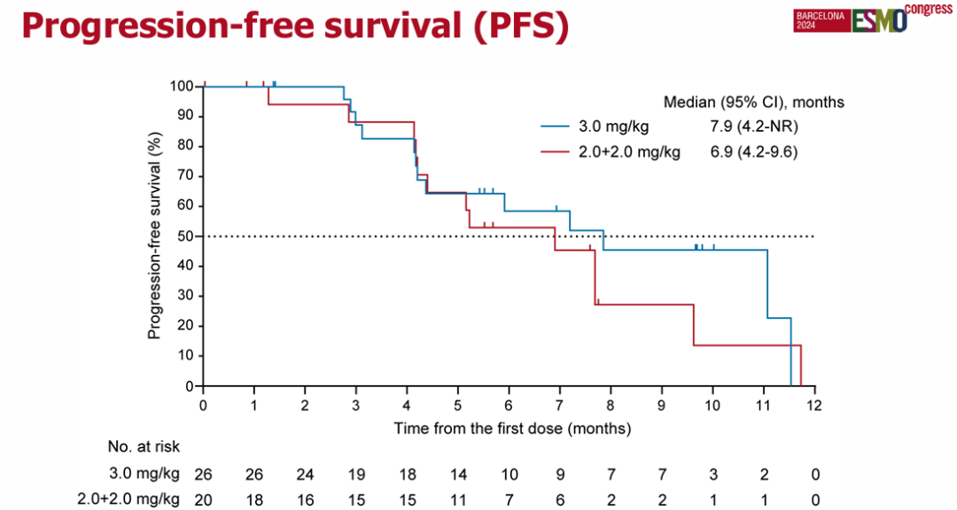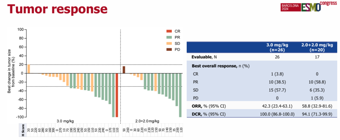 一般情况下,铂耐药卵巢癌患者接受普通化疗的有效率略高于20%。但SHR-A1921治疗TROP-2低表达患者可使约1/3的患者达到ORR,而且TROP-2中高表达患者的缓解率更高。在这项研究中,3.0 mg/kg剂量组的ORR为42.3%,2.0+2.0 mg/kg两次给药方案的ORR为58.8%,这是非常好的ORR数据。