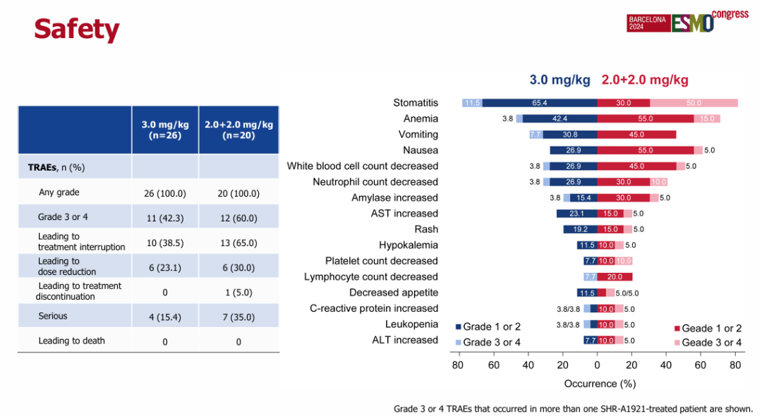 SHR-A1921的效果不错,但也存在一些问题,比如毒副作用。尽管没有出现患者死亡,较高比例的患者出现了3~4级毒副作用,包括口腔黏膜炎、贫血和粒细胞下降等血液系统毒性。对于口腔黏膜炎的处理,除了漱口、保持口腔卫生之外并没有特别好的治疗方法。