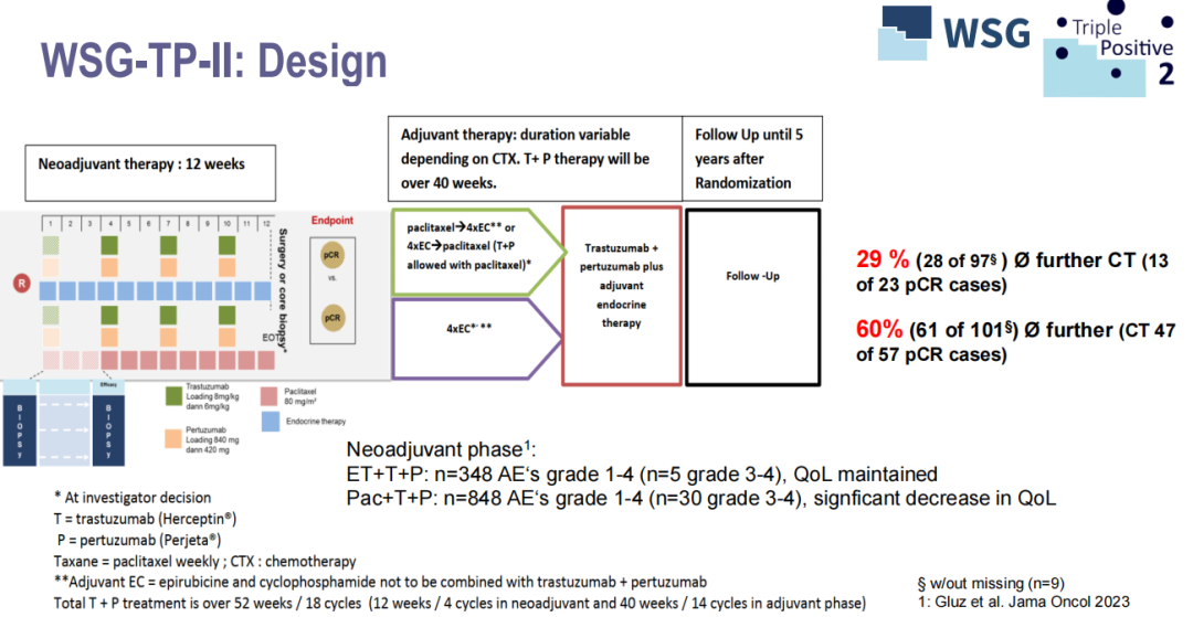 WSG-TP-II是一项前瞻性、多中心、随机2期试验,该试验将经中心确认的HR+/HER2+(ER和/或PR>1%)EBC(临床分期I~III期)患者随机分组,分别接受12周新辅助标准ET+T+P和Pac q1w+T+P治疗,之后接受标准ET(至少5年)+T+P治疗1年(+/-辅助CT)。我们建议所有pCR患者(主要终点)不再接受进一步的辅助CT。次要终点为无事件生存期(EFS)、无侵袭性疾病生存期(iDFS)、无远处疾病生存期和总生存期(OS)。
