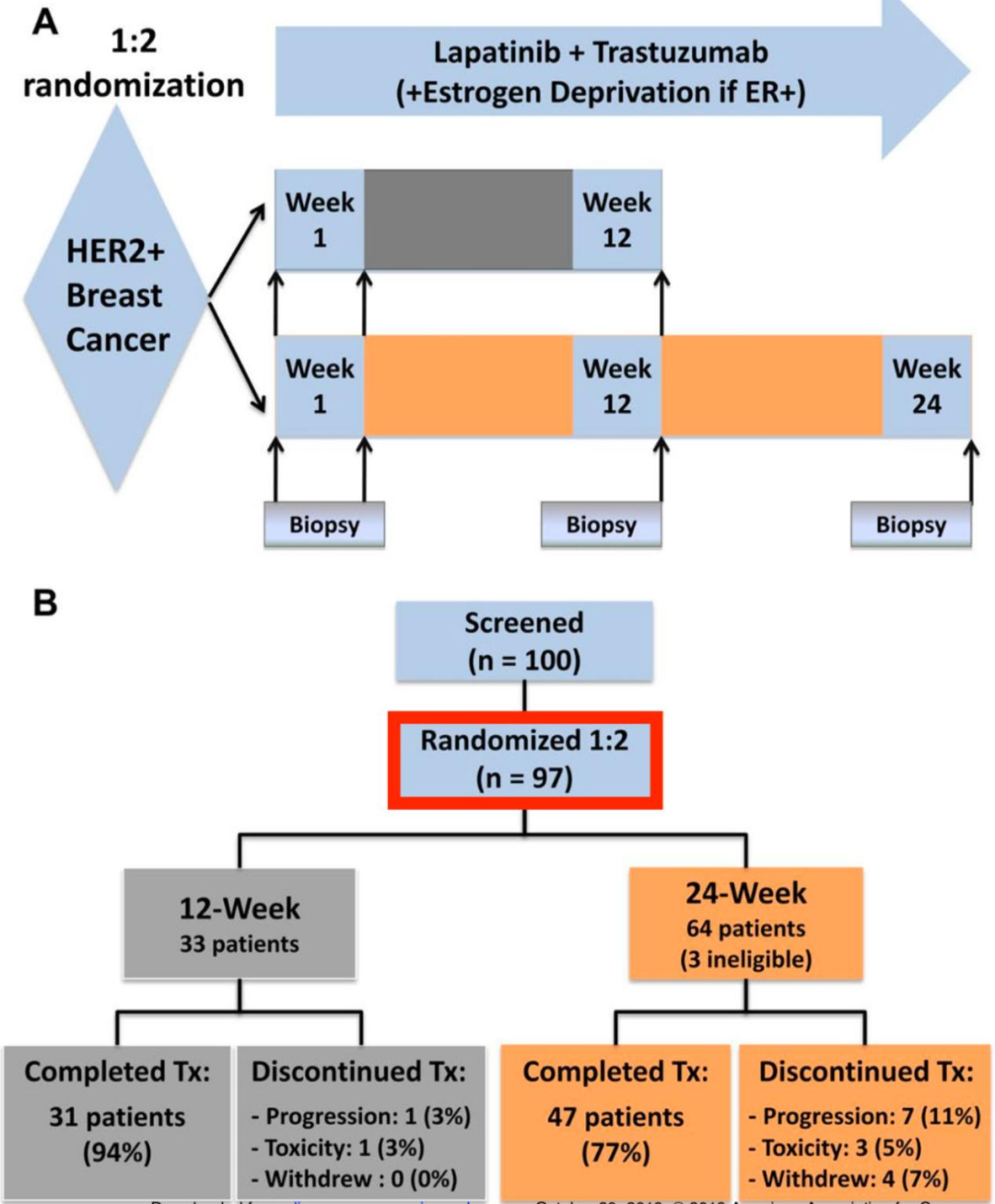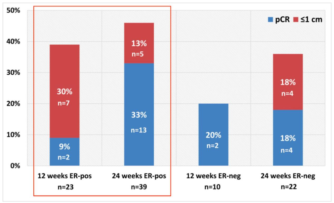 TBCRC023研究发现在拉帕替尼(Lap)与曲妥珠单抗的双靶联合内分泌治疗的实验组中术前给予24周治疗的pCR率显著高于12周(33%vs 9%)。大胆设想,WSG-TP-II研究若再设一实验组HP+ET术前完成24周,pCR率又会怎样?这一组可能会得到更高的pCR率,从而相应增加可能豁免化疗的人数。