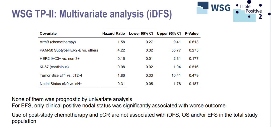 WSG-TP-II研究有以下几个特点:1.术前短疗程(4周期/12周)的窗口观察期即可取得很好的pCR和生存结局;2.根据主要研究终点术后pCR与否,决定完全豁免化疗或补全化疗(靶向治疗TP组合延续至1年,内分泌治疗至少5年)是可行的,换言之,短程观察窗所得到的药物敏感信息可以有效地指导辅助用药方案;3.入组患者中II-III期占比一半以上,即中高危者;4.将生存时间作为观察的次要终点;5.基线腋窝淋巴结负荷是唯一与不良生存相关的预测因子而非新辅助治疗的方案。