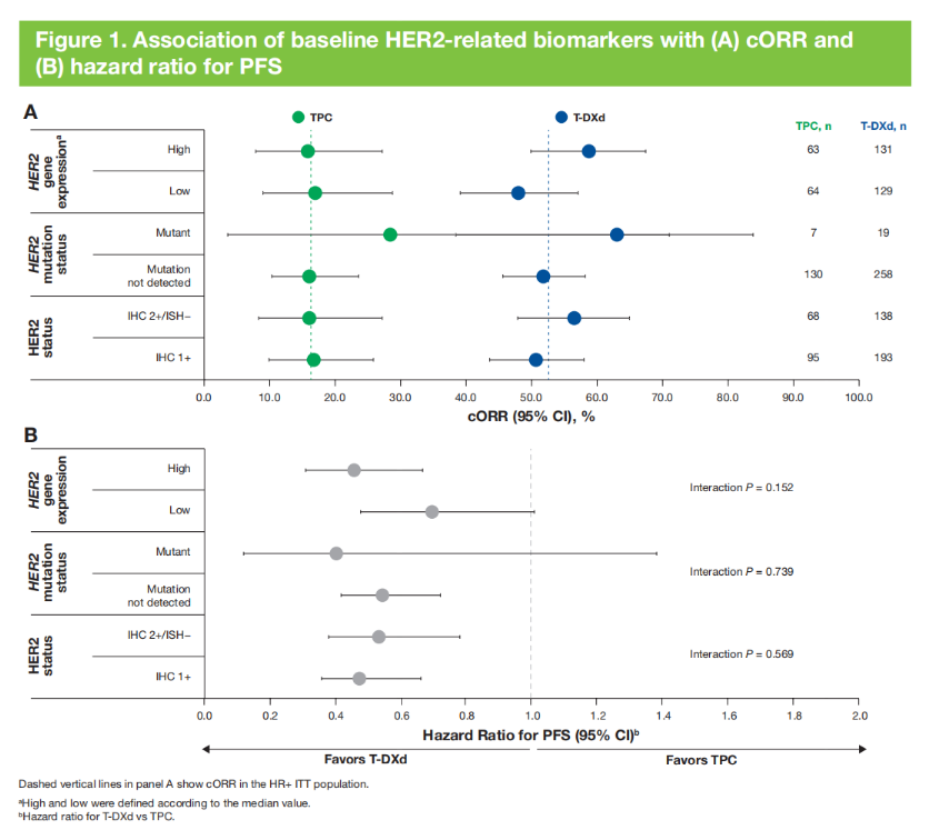 无论HER2免疫组化(IHC)状态、HER2基因表达水平或HER2突变状态如何,均观察到T-DXd组相较于TPC组的临床获益,且基于这些HER2生物标志物的分析未显示出统计学上的显著交互作用(图1、图2)。
