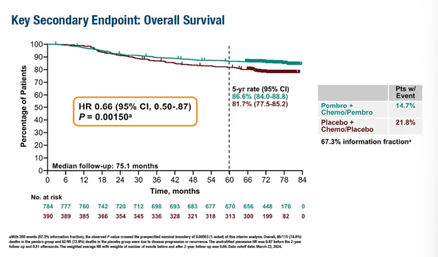 共有1174例患者被随机分配至帕博利珠单抗组(n=784)或安慰剂对照组(n=390)。根据预设的数据截止日期(2024年3月22日),中位随访时间为75.1个月(范围65.9-84.0个月)。帕博利珠单抗组有115例(14.7%)患者死亡,安慰剂组有85例(21.8%)患者死亡;对应风险比(HR)为0.66(95%CI 0.50~0.87;P=0.0015),达到了预先设定的显著性阈值0.00503。