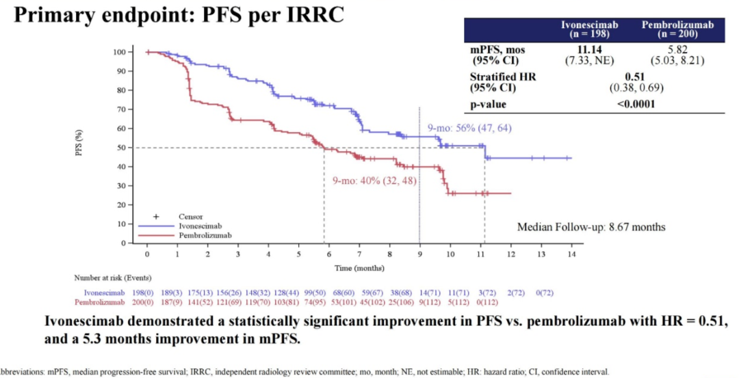 最终,依沃西单抗组和帕博利珠单抗组分别入组198例和200例患者,两组患者基线特点均衡可比。PD-L1≥50%的患者,占比分别为41.9%和42.5%,脑转移患者占比分别为16.7%和19.5%。数据分析时,两组中位PFS分别为11.14个月和5.82个月,HR=0.51,P<0.0001。亚组分析显示,不同临床病理特点的患者都可以从这一治疗中获益,PD-L1表达1%-49%的患者和PD-L1≥50%的患者,HR分别为0.54和0.46;鳞癌和非鳞癌患者,两组HR分别为0.48和0.54,ORR分别为50.0%和38.5%,中位DoR均未达到,DCR分别为89.9%和70.5%。两组全因任何级别不良反应发生率分别为89.8%和81.9%,3级以上不良反应发生率分别为29.4%和15.6%,严重不良事件(SAE)发生率分别为20.8%和16.1%,因不良反应而导致治疗终止的比例分别为1.5%和3.0%。两组蛋白尿发生率分别为31.5%和10.1%,其中,依沃西单抗组3级以上蛋白尿发生率为3.0%;两组高血压发生率分别为15.7%和2.5%,依沃西单抗组3级以上高血压发生率为5.1%;两组免疫相关不良反应发生率为29.9%和28.1%,3级以上免疫相关不良反应发生率为7.1%和8.0%;严重免疫相关不良反应发生率分别为5.6%和11.1%。