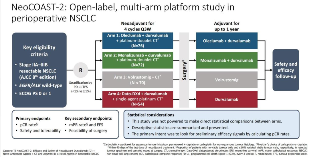 Oleclumab是一款针对CD73的单克隆抗体,Monalizumab是一款针对NKG2A的单克隆抗体,度伐利尤单抗与两药联合显示了协同作用。Dato-Dxd是一款针对TROP-2的抗体药物偶联物(ADC),既往研究显示,度伐利尤单抗联合化疗新辅助治疗可切除的NSCLC患者,相较于单纯化疗改善了患者的完全病理学缓解率(p-CR)及无事件生存期(EFS)。这一多中心、多队列临床研究旨在探索这些组合在可切除NSCLC患者中的疗效及安全性。这是一项随机、多队列临床研究,纳入可切除的IIa-IIIb期NSCLC患者,患者不携带驱动基因突变,符合入组标准的患者随机分为队列1:Oleclumab联合度伐利尤单抗联合含铂双药治疗;队列2:Monalizumab联合度伐利尤单抗联合含铂双药化疗;队列3,Volrustomig联合化疗;队列4,Dato-Dxd联合度伐利尤单抗联合铂类药物治疗。4周期诱导治疗后手术,术后给予1年的免疫维持治疗。该研究不进行统计假设,各组之间不进行疗效比较,主要研究终点为安全性及p-CR,次要研究终点为主要病理缓解(MPR)和EFS。其中,队列3提前关闭。