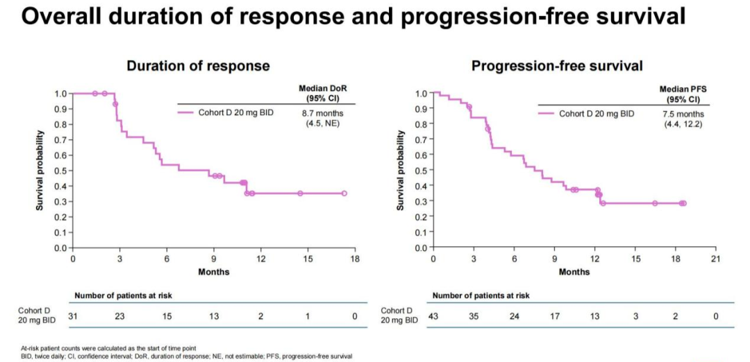队列D共入组44例患者,腺癌患者占比为95.5%,至诊断中位时间为16.0个月,插入患者占比为70.5%,脑转移患者占比18.2%,既往分别有45.5%、22.7%和31.8%的患者接受过一线、二线及超过三线的治疗,56.8%的患者接受过铂类药物及免疫检查点抑制剂的治疗。全组患者ORR和DCR分别为72.1%和83.7%。中位随访时间10.9个月后,36.4%的患者治疗仍然持续,响应时间超过12个月的患者占比为31.8%,中位DoR和中位PFS分别为8.7个月和7.5个月。携带插入突变的患者共计43例,ORR和DCR分别为90.0%和96.7%,中位DoR和中位PFS分别为9.7个月和9.9个月。携带插入突变和其他类型突变的患者,中位PFS分别为9.9个月和3.9个月。任何级别TRAE发生率为95.5%,其中,3级以上TRAE发生率为43.2%,最常见的为腹泻(86.4%,3级25.0%),其次为恶心(20.5%,3级4.5%)。